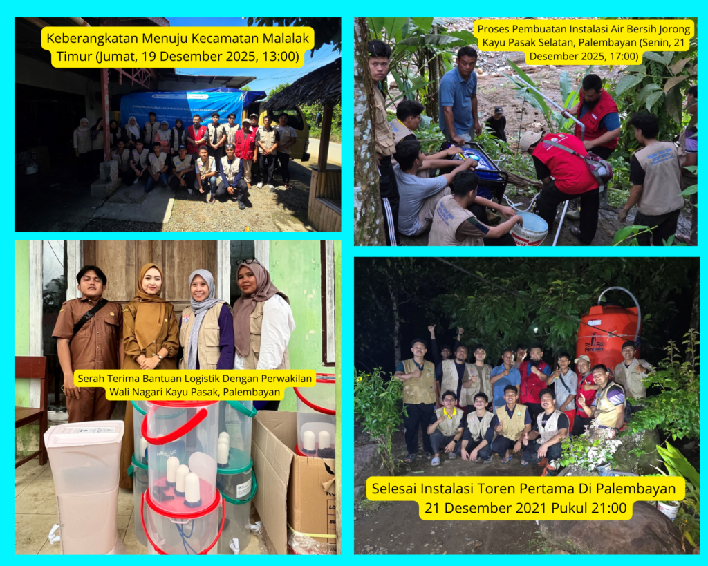 Sementara itu, di Nagari Salareh Aia, Kecamatan Palembayan (Jorong Kayu Pasak Selatan dan Kampung Tengah Barat), tim UNS menyalurkan bantuan kepada 172 penyintas, membangun tiga instalasi tandon air 1.000 liter lengkap dengan pompa submersible, mendistribusikan 26 unit filter air siap minum, serta menyediakan genset dan power pack bagi sekolah, puskesmas, dan posko kebencanaan setempat.