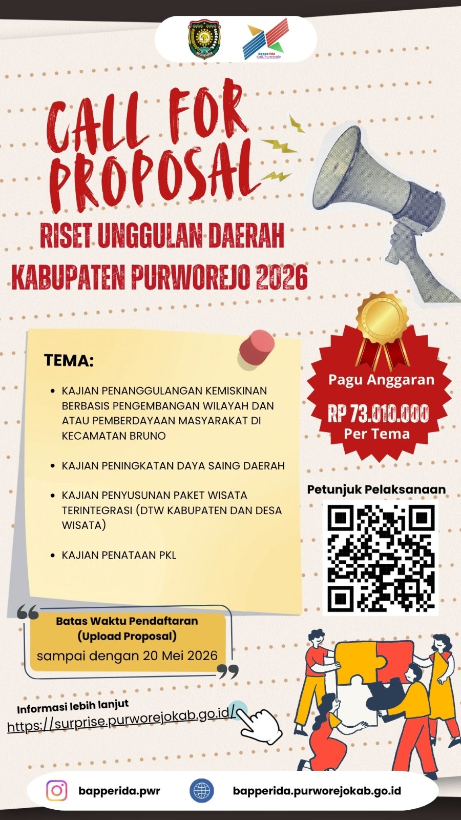 Diinformasikan kepada seluruh Tenaga Pendidik/Dosen/Peneliti, BAPPERIDA membuka pendaftaran Proposal Sosialisasi Riset Unggulan Daerah (RUD) Kab. Purworejo Tahun 2026